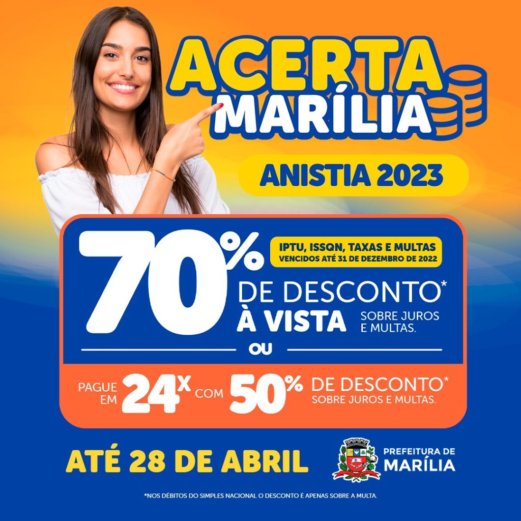 A segunda fase da anistia 2023, o Programa de Regularização de Débitos da Prefeitura Municipal de Marília, continua até o próximo dia 28 de abril. Conforme informações do secretário municipal da Fazenda, Ramiro Bonfietti, nesta nova fase o contribuinte terá direito a 70% de desconto sobre juros e multas se optar pelo pagamento à vista. “Conforme estabelecido pela Lei Complementar 956/2023, a anistia 2023 é destinada aos contribuintes com débitos vencidos até 31 de dezembro de 2022”, explicou. O desconto de 70% de juros e multas no pagamento à vista é válido também para dívidas junto ao Departamento de Água e Esgoto de Marília (Daem) e Emdurb (Empresa de Mobilidade Urbana de Marília). Contribuinte que desejar regularizar e ficar adimplente, pode agendar o atendimento no Ganha Tempo Municipal, através do link: https://agendamento.marilia.sp.gov.br/cidadao/login. O Ganha Tempo fica na avenida das Indústrias, nº 294, ao lado do Procon, centro, e funciona de segunda a sexta-feira, das 8h às 17 horas. Mais informações podem ser obtidas através do WhatsApp (14) 3402-6000.