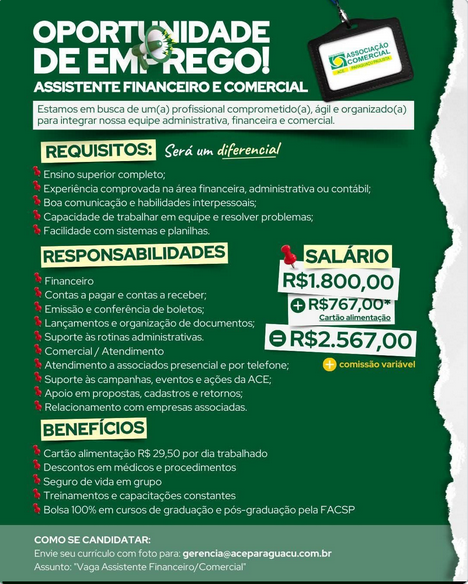 A Associação Comercial de Paraguaçu Paulista anunciou a abertura de uma vaga de emprego para o cargo de Assistente Financeiro e Comercial, buscando profissionais que demonstrem agilidade, organização e comprometimento.