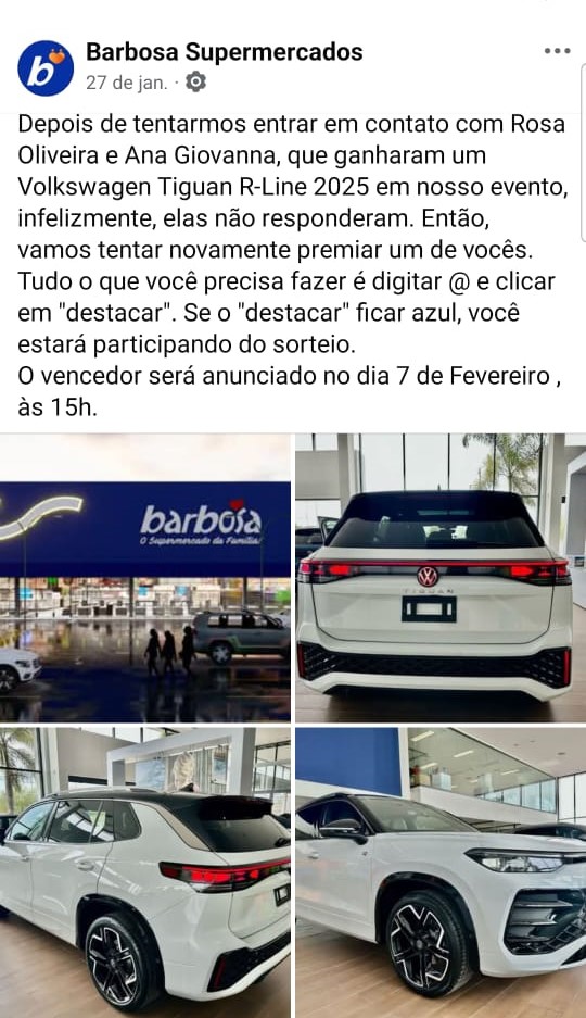 Desta vez, a onda do sorteio está usando o nome da rede Barbosa Supermercados, com sede em Guarulhos, e que tem filiais em várias cidades da Grande São Paulo, além de uma na capital. A isca para atrair as pessoas é um novo ‘sorteio’ de um VW Tiguan R-Line 25, cujos ganhadores anteriores não teriam retirado o prêmio.