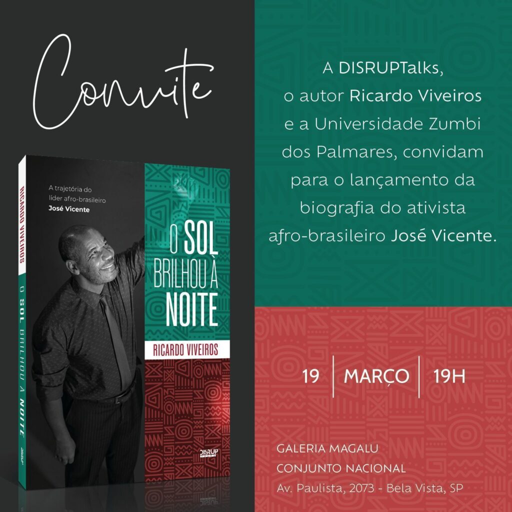 “O sol brilhou à noite – A trajetória do líder afro-brasileiro José Vicente” (editora DisrupTalks), do jornalista e escritor Ricardo Viveiros, será lançado hoje, 19 de março de 2026, às 19 horas, na Galeria Magalu (antiga Livraria Cultura), no Conjunto Nacional, em São Paulo. “A biografia que trago neste livro é poderosa e aponta para um projeto de Brasil em que todos, independentemente da cor, possam sonhar, estudar, trabalhar e viver com dignidade. Conquistar por mérito próprio a tal da felicidade”, observou o autor na apresentação da obra.