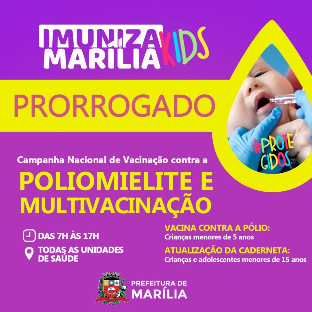 A Prefeitura de Marília, por meio da Secretaria Municipal da Saúde, lembra a todos que a Campanha Nacional de Multivacinação e Poliomielite foi prorrogada até o próximo dia 30 de setembro, de acordo com o Ministério da Saúde.