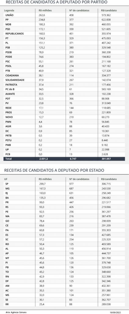 O União lidera as receitas de campanha para Câmara dos Deputados, com R$ 262,6 milhões declarados por 458 candidatos. A média de receita é de R$ 573 mil por deputado. Em seguida, os partidos que mais investiram na campanha para deputado federal são o PP (R$ 234,8 milhões), MDB (R$ 180,3 milhões), PSD (R$ 172,1 milhões), Republicanos (R$ 160,5 milhões), PT (R$ 156,3 milhões), PL (R$ 151,1 milhões) e PSB (R$ 125,2 milhões).