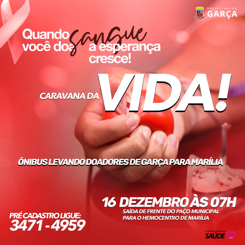 A Secretaria de Saúde, em parceria com o Hemonucleo  de Marília, realizará uma grande corrente do bem através da doação espontânea de sangue no sábado, dia 16 de dezembro. O ônibus tem o ponto de partida no Paço Municipalàs 7h da manhã. Em dezembro, a Caravana acontece no dia 16 de dezembro, em virtude das festas de final de ano.