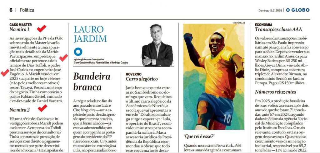 A edição do último domingo (8) da coluna do jornalista Lauro Jardim, no jornal O Globo, trouxe à tona novos desdobramentos sobre as investigações da Polícia Federal (PF) e da Procuradoria-Geral da República (PGR) no chamado “Caso Master”. O foco das apurações recai sobre a Maridt Participações, empresa que pertence aos irmãos do ministro Dias Toffoli — o padre José Carlos e o engenheiro José Eugênio —, ambos residentes em Marília.