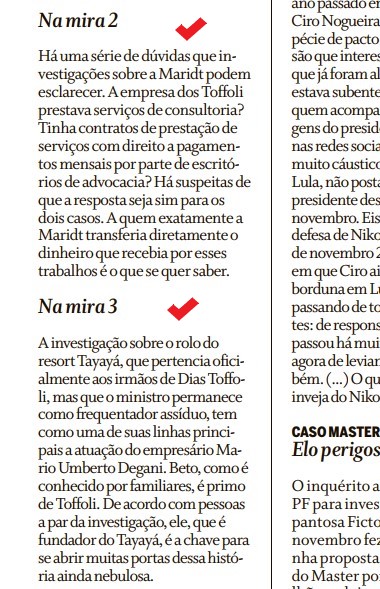 Além das transações imobiliárias, a coluna levanta questionamentos sobre a natureza dos serviços prestados pela empresa dos irmãos Toffoli. Lauro Jardim afirma que “há uma série de dúvidas que investigações sobre a Maridt podem esclarecer”, citando suspeitas de contratos de consultoria com pagamentos mensais por parte de escritórios de advocacia. Outro ponto central da apuração é a atuação de Mario Umberto Degani, o “Beto”, primo de Toffoli e fundador do Tayayá, descrito pela publicação como a “chave para se abrir muitas portas dessa história ainda nebulosa”.