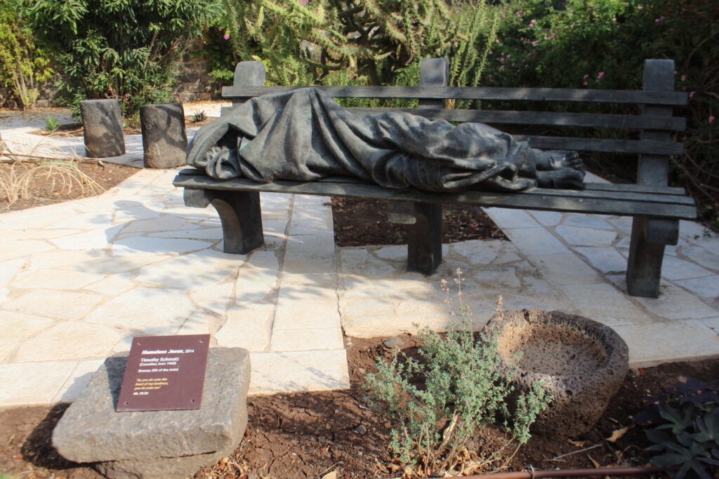 Desenvolvida em 2014 pelo artista plástico Timothy Schmalz, esta obra de arte a céu aberto concebida no mundo pós-moderno integra a passagem do mundo histórico, numa cidade que sofreu as consequências por ignorar a imensidão de um dos seus muitos moradores de um passado quase mitológico. Cafarnaum sucumbiu, virou ruínas. Jesus, por sua vez, é lembrado há 2026 anos e suas palavras ainda são seguidas e inspiram milhões de pessoas. É do Evangelho de Mateus que o canadense retirou a inspiração para o ‘Homeless Jesus, 2014’ [‘As you do unto the least of my brethren, you do unto me’, complementa a placa que apresenta a obra aos visitantes do mundo inteiro que querem estar na mesma cidade do Cristo]. O versículo nos informa que ‘o que fizeres ao mais humilde dos meus irmãos, a mim o farás’ — os ‘the least’ são os desamparados, pessoas para as quais o Nazareno pregava no Mar da Galileia dois mil anos atrás.