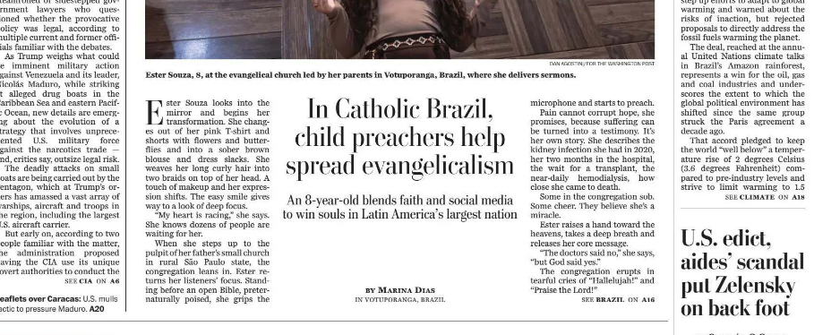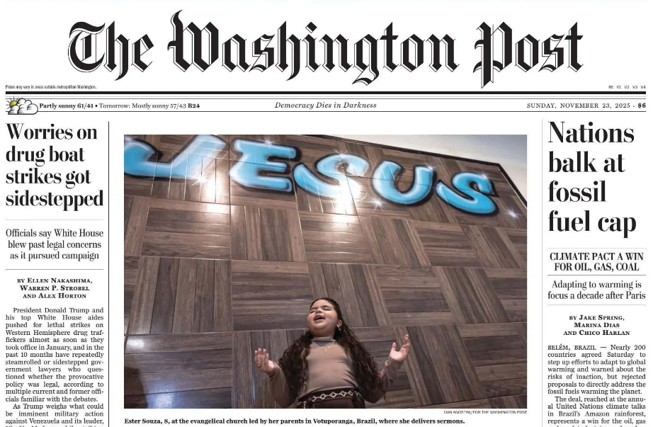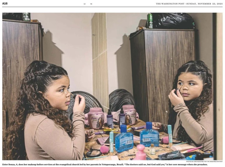 Com foto na capa e uma reportagem de duas páginas inteiras, a edição de domingo, dia 23 de novembro de 2025, de um dos maiores jornais do mundo, o The Washington Post – lendário veículo de comunicação dos Estados Unidos que derrubou o ex-presidente Richard Nixon nos anos de 1970 denunciando o escândalo ‘Watergate’ – trouxe em destaque a menina Ester Souza, de 8 anos de idade. A criança – que foi destaque no Show de Calouros, do SBT – possui quase um milhão de seguidores em seu perfil no Instagram e vem ganhando espaço nos corações e mentes de cristãos evangélicos ao fazer reflexões bíblicas e pregar o evangelho.