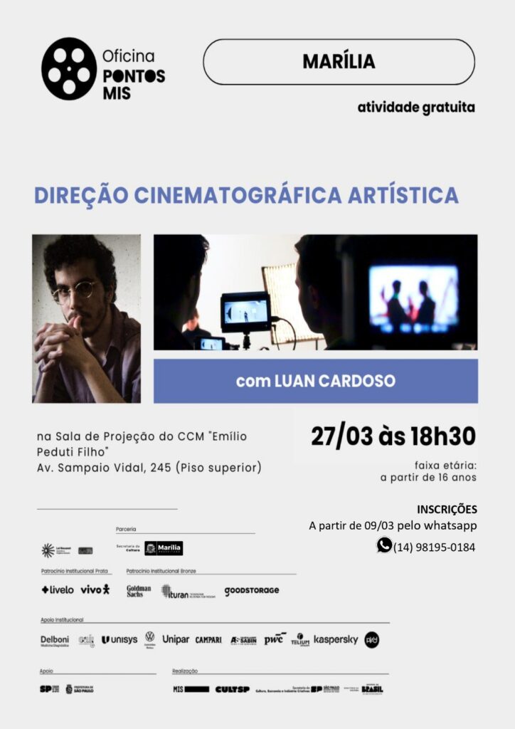 A Prefeitura de Marília, por meio da Secretaria da Cultura, está com inscrições abertas para a atividade gratuita Pontos MIS: “Direção Cinematográfica Artística”. A oficina acontecerá no próximo dia 27 de março, uma sexta-feira, às 18h30, na Sala Municipal de Projeção do CCM “Emílio Pedutti Filho”, que fica no complexo cultural Braz Alécio, na avenida Sampaio Vidal, 245 , piso superior.