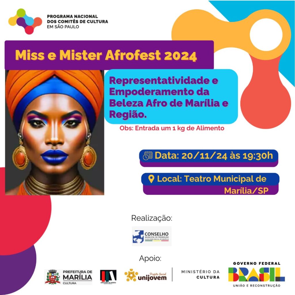 A partir das 19h terá início o Miss e Mister Afrofest 2024, com objetivo de valorizar a beleza da diversidade da cultura negra. O concurso é dividido nas categorias 14 a 17 anos (miss e mister) e acima de 18 anos (miss e mister). A entrada para o concurso será um quilo de alimento não perecível.