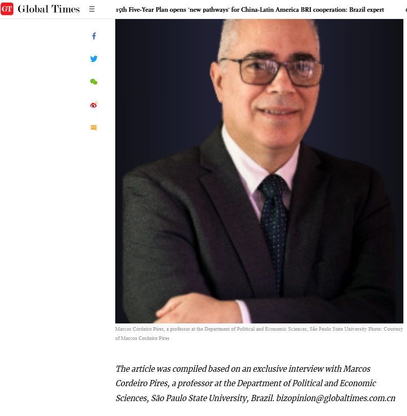 O diretor do Unity Global Institute, professor doutor Marcos Cordeiro Pires, assinou o artigo intitulado ‘15th Five-year plan open ‘new pathways’ for China-Latin America BRI cooperation: Brazil expert’. O texto, publicado pela edição em inglês do jornal chinês The Global Times, foi elaborado com base em uma entrevista exclusiva concedida pelo especialista brasileiro, onde projeta uma mudança estrutural na relação econômica entre o gigante asiático e os países latino-americanos.