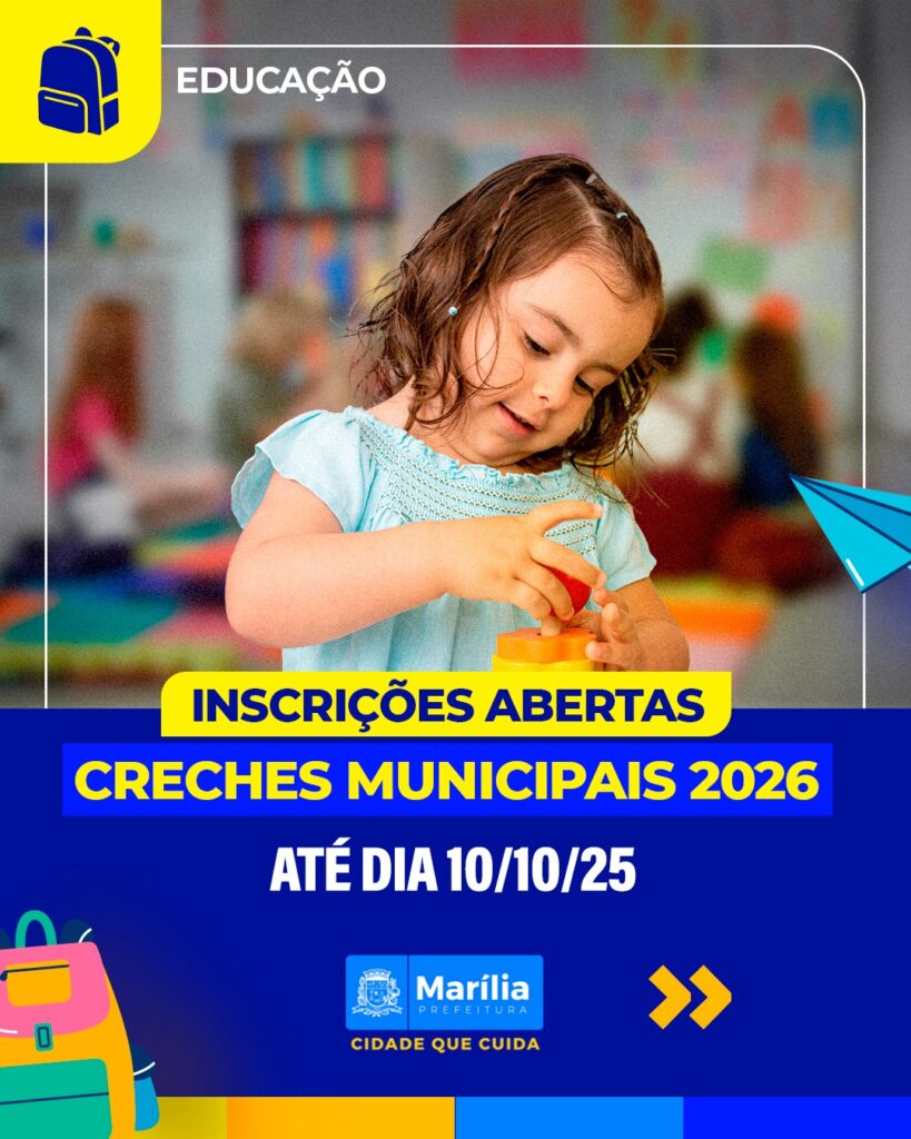 Termina nesta sexta-feira (dia 10), o período de inscrições na Central de Vagas referente ao ano letivo de 2026. A Prefeitura de Marília, por meio da Secretaria Municipal da Educação, ressalta que a partir de 11 de outubro, as inscrições continuam, mas passam a ser organizadas por ordem de registro. Crianças nascidas entre abril de 2022 e setembro de 2025 podem fazer o cadastro na Central de Vagas da Secretaria da Educação. Crianças a partir de 4 anos devem procurar diretamente a escola.