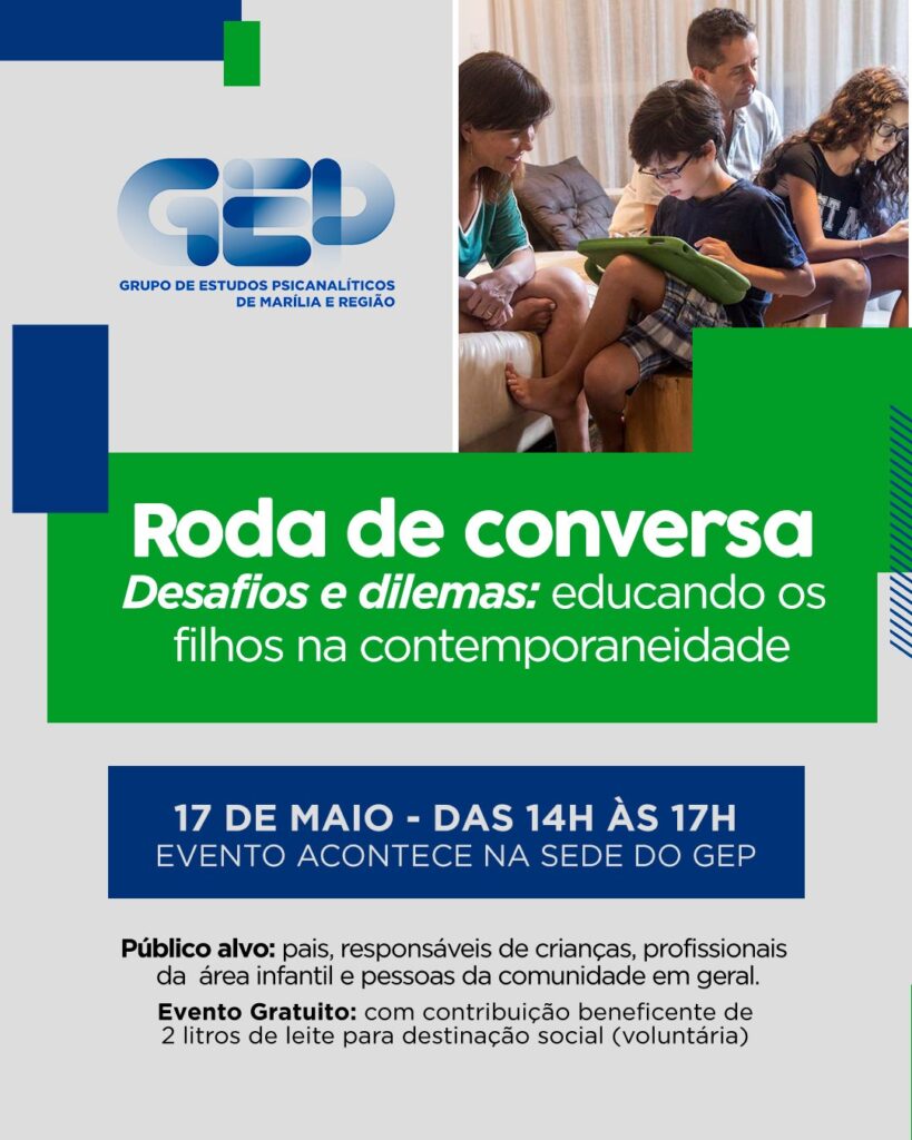 O GEP – Grupo de Estudos Psicanalíticos de Marília e região promoverá no próximo sábado, 17 de maio, uma Roda de Conversa com o tema “Desafios e dilemas: educando os filhos na contemporaneidade”.