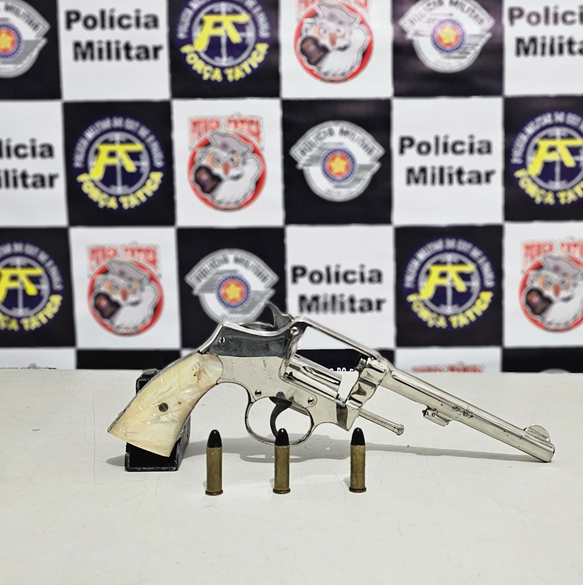 Após a abordagem, a equipe policial obteve informações precisas sobre a localização de uma arma de fogo utilizada em ações criminosas, que estaria escondida na residência utilizada pelo suspeito. Em diligência ao local indicado, os militares localizaram um revólver calibre 38, que estava municiado com três cartuchos intactos, prontos para uso.