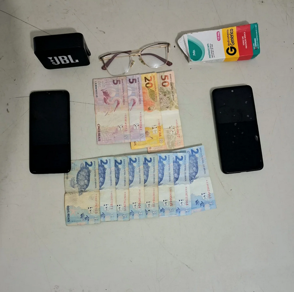 Durante o cerco policial e as buscas nas imediações, os agentes identificaram sinais de invasão em um segundo estabelecimento comercial. Com o apoio de outras viaturas, foi realizada uma varredura minuciosa no local, resultando na localização do suspeito, que estava escondido no interior de um sofá. Com ele, foram recuperados dois aparelhos celulares, uma caixa de som, óculos de grau, medicamentos e a quantia de R$ 96,00 em espécie.
