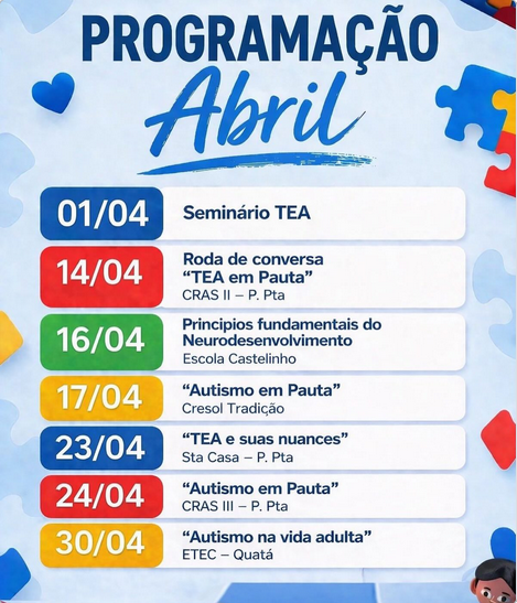 Além dos eventos futuros, a campanha deste ano já registrou importantes marcos de engajamento regional. O mês foi inaugurado com o Seminário TEA no dia 1º de abril e, nesta terça-feira, dia 14, foi realizada uma produtiva roda de conversa no CRAS II. Todas as iniciativas capitaneadas pela Dra. Priscila Reis e Marcelo Vergílio visam fortalecer a rede de apoio local, unindo a expertise clínica do Instituto Equilibre à necessidade de disseminar conhecimento prático sobre o desenvolvimento neuroatípico para familiares, profissionais e educadores da região.