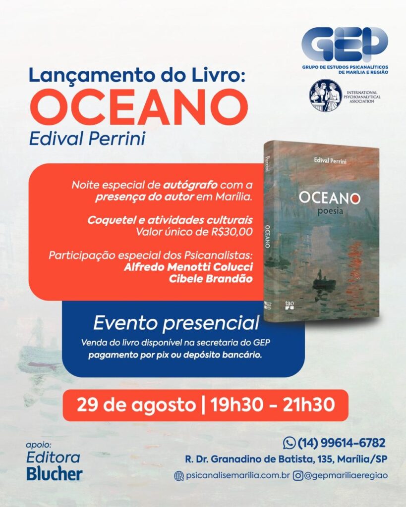 O Grupo de Estudos Psicanalíticos de Marília e Região (GEP) anunciou o coquetel de lançamento do livro ‘Oceano’, do psicanalista Edival Perrini. O evento, que promete uma noite especial de cultura, arte e psicanálise, será realizado nesta sexta-feira, 29 de agosto, das 19h30 às 21h30, na rua Dr. Granadino de Batista, nº 135.