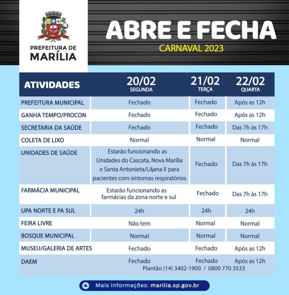 A Feira livre funcionará nos dias 21 e 22 de fevereiro. O Museu de Paleontologia e a Galeria de Artes retornarão às atividades somente no dia 22 de fevereiro, a partir das 12 horas. O Daem (Departamento de Água e Esgoto de Marília), Paço Municipal e os serviços do Ganha Tempo e do Procon Municipal terão seu funcionamento normalizado no dia 22 de fevereiro, a partir das 12h.