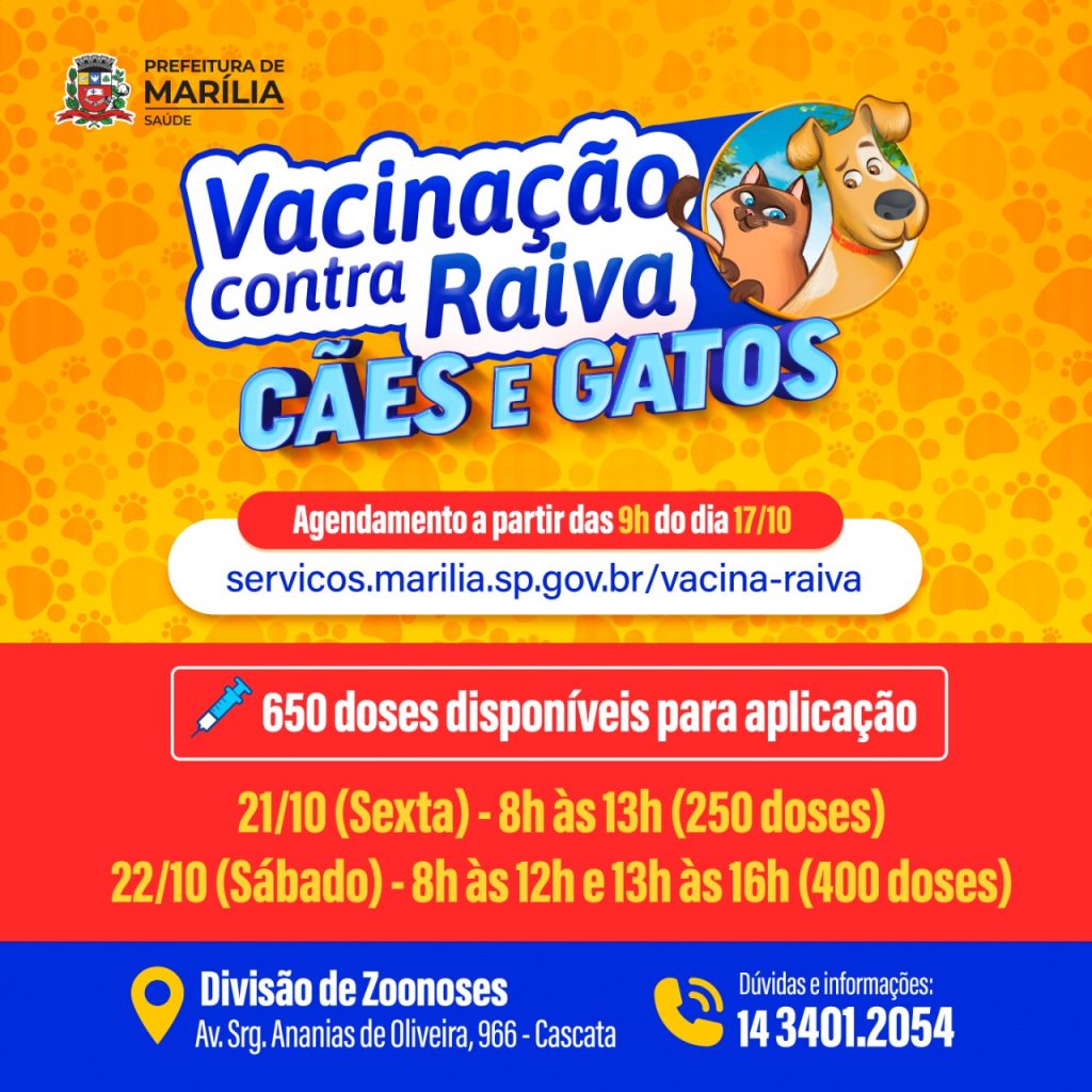 A Prefeitura de Marília, por meio da Secretaria Municipal da Saúde, vai promover nos dias 21 (sexta-feira) e 22/10 (sábado) mais uma vacinação antirrábica (contra a raiva) de cães e gatos.
