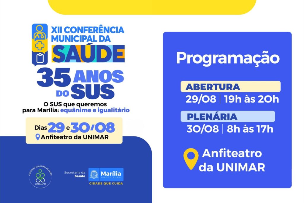 A Prefeitura de Marília, por meio da Secretaria Municipal de Saúde e em parceria com o Conselho Municipal de Saúde (COMUS), realiza nos dias 29 e 30 de agosto, no Anfiteatro da Unimar (Universidade de Marília), a XII Conferência Municipal da Saúde – com o tema “35 anos do SUS, o SUS que queremos para Marília: equânime e igualitário”.