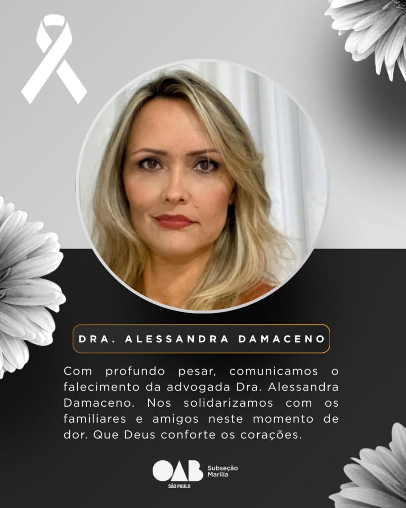 O falecimento de Alessandra, ocorrido ontem, domingo (12), causou comoção entre os profissionais do Direito na cidade. Em resposta à perda, a 31ª Subseção da Ordem dos Advogados do Brasil (OAB) de Marília emitiu uma nota oficial de falecimento, manifestando solidariedade aos parentes e colegas de classe. A entidade destacou a atuação da advogada em seus quadros, reforçando o impacto de sua partida precoce.