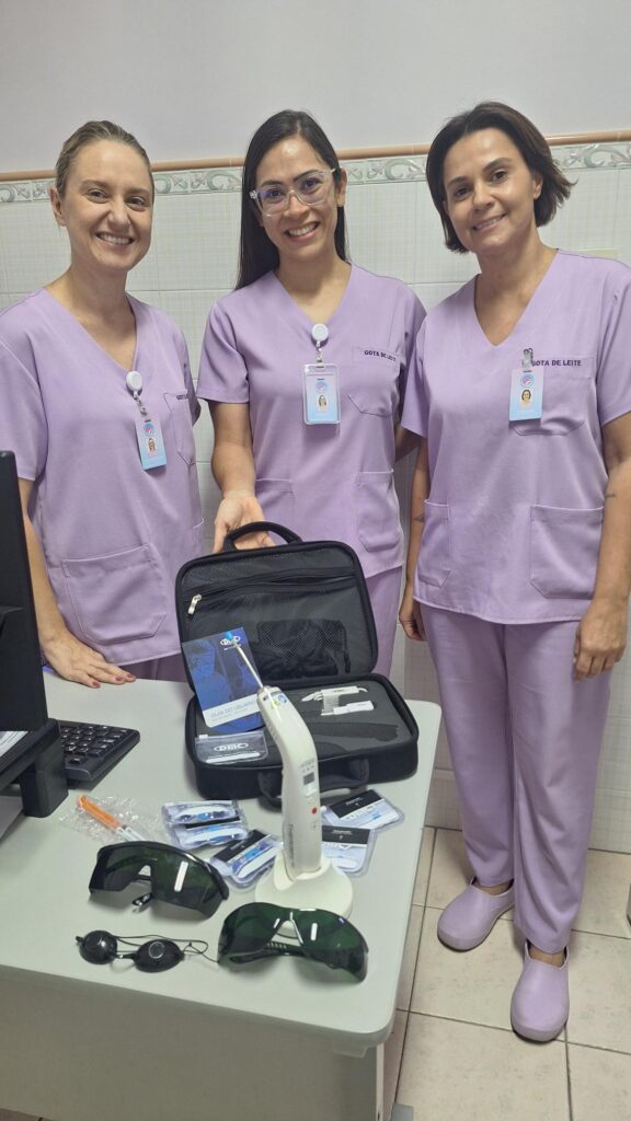 “Esse é um investimento da Maternidade na qualidade de assistência em Saúde”, salientaram as Enfermeiras Responsáveis, Carolina Rodrigues e Patrícia Truzzi Gilio, e a Fonoaudióloga Fabiana Baldassim. Com a chegada do equipamento à Maternidade, o trio profissional elabora os protocolos para nortear o uso do equipamento e fará o treinamento da equipe para a aplicação do laser.