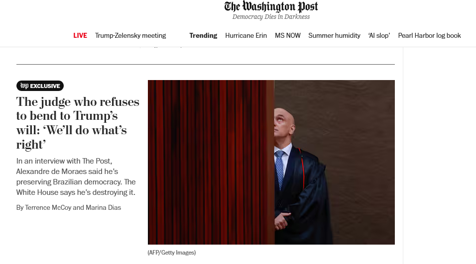 Alexandre de Moraes está na capa desta 2ª-feira de um dos maiores jornais dos EUA e do mundo, The Washington Post