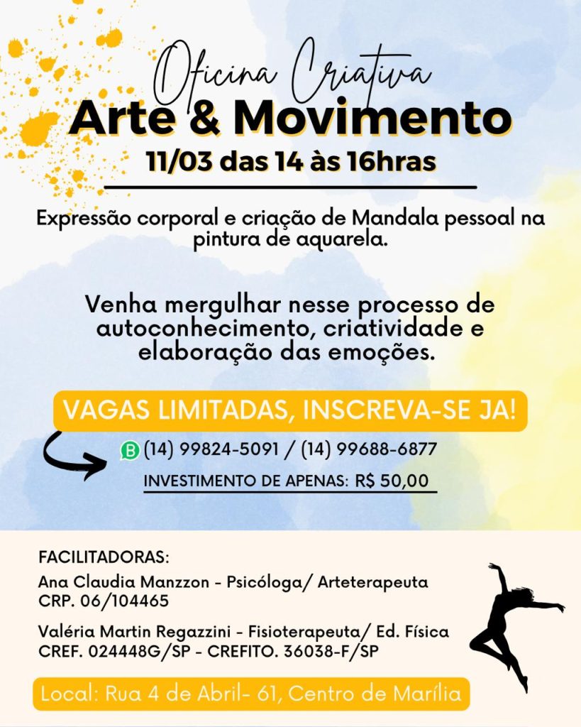 A oficina criativa de arteterapia Arte e Movimento será realizada pelas facilitadoras Ana Cláudia Manzon (psicóloga e arteterapeuta) e Valéria Martins Regazzini (fisioterapeuta e educadora física) no próximo dia 11 de março, das 14h às 16 horas, à rua Quatro de Abril, n.º 61, centro de Marília.