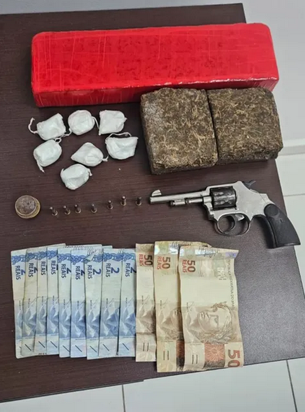 Durante a inspeção minuciosa realizada no dormitório do suspeito, as equipes localizaram, no interior da gaveta de uma cômoda, três tabletes de maconha, sete porções de cocaína e a quantia de R$ 173,90 em espécie. A continuidade das buscas revelou um perigo ainda maior oculto sob o colchão da cama do indivíduo: uma arma de fogo de calibre .22, da marca Rossi, que se encontrava municiada com sete projéteis intactos. Todo o material ilícito foi imediatamente apreendido pelos agentes para servir como prova no inquérito que apura as atividades criminosas do investigado.