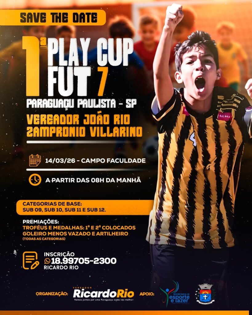 A 1ª Play Cup Fut 7 Paraguaçu Paulista ocorre em 14 de março, a partir das 8h, com apoio da Prefeitura Municipal, Lions Clube, AFAGA, Guarda Civil e secretarias de Esporte e Saúde.