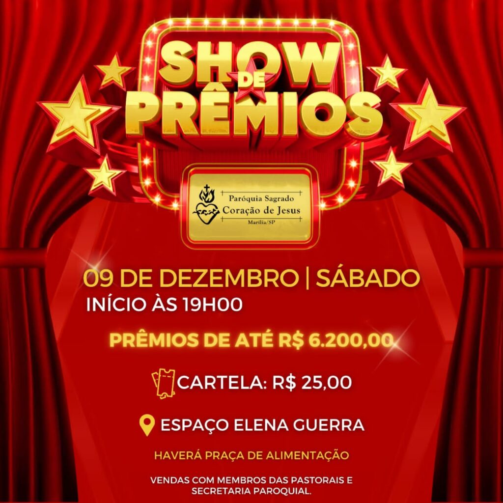 Neste sábado, 09 de dezembro, a comunidade da Paróquia Sagrado Coração de Jesus, realiza no espaço Helena Guerra, localizado na Rua Benedito Alves Delfino, o “Show de Prêmios”, a partir das 19h.