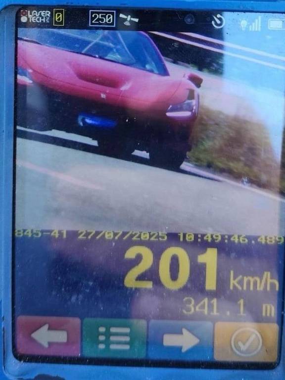 Uma Ferrari F8 Tributo, com motor V8 que alcança a velocidade máxima de 340 km/h, foi flagrada no final de semana a mais de 200 km/h, em rodovia no Interior de São Paulo, informou neste domingo, dia 27 de julho de 2025, o jornal Folha de S. Paulo. O caso aconteceu na rodovia estadual SP-147, em Limeira.