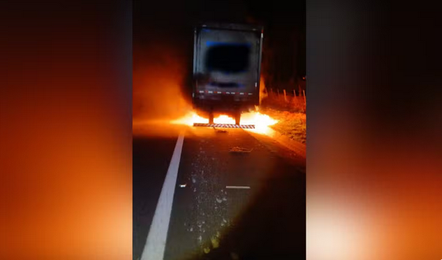 Pneu de carreta estoura e veículo pega fogo em Marília