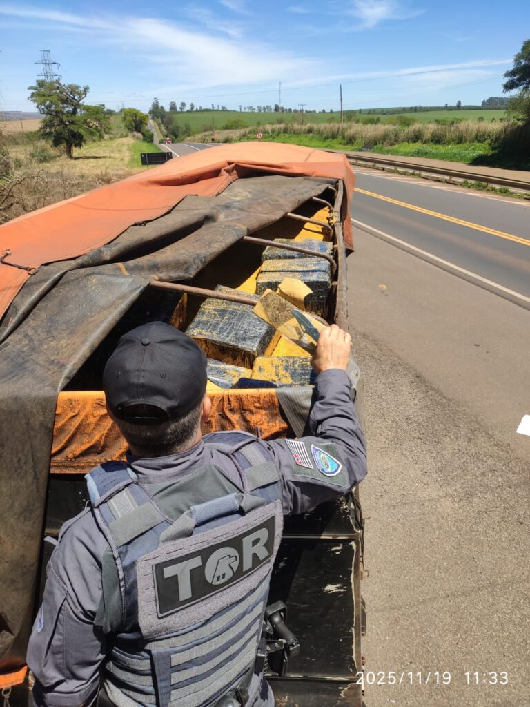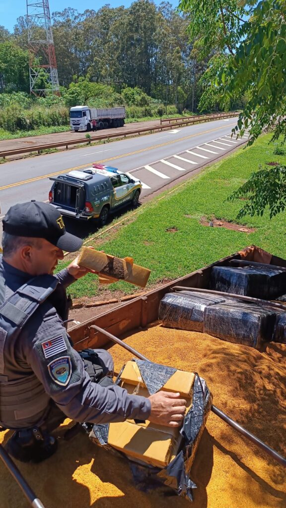 A pesagem da grande carga de entorpecentes apreendida na tarde de ontem (19) na Rodovia Raposo Tavares (SP-270) foi concluída, e o volume total chega a impressionantes 1.279 quilos de maconha. A droga, distribuída em mais de 60 fardos, estava escondida em meio a uma carga de soja transportada por uma carreta Scania/R113, que tracionava dois semirreboques Randon. A apreensão foi resultado de uma operação conjunta entre o Policiamento Rodoviário e a Força Integrada de Combate ao Crime Organizado (FICCO/SP), no município de Bernardino de Campos.