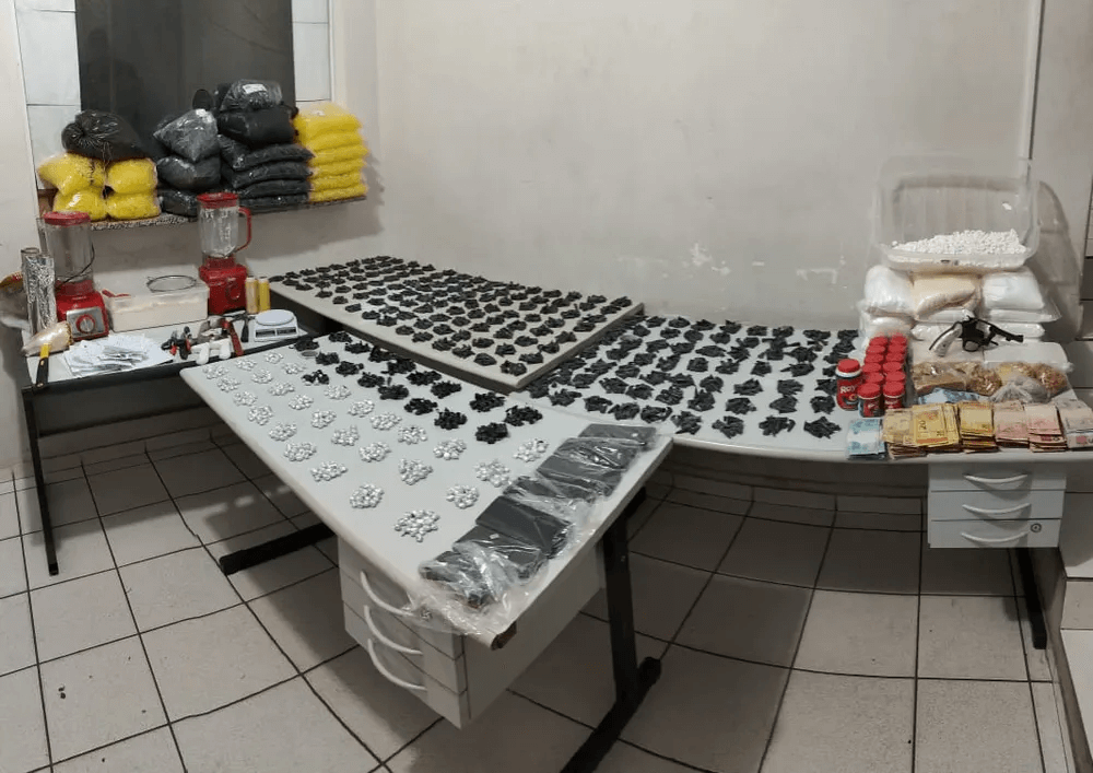 Diante da situação, os agentes prontamente realizaram a abordagem. Durante a vistoria do automóvel, foi encontrada uma porção considerável de cocaína, além de potes de fermento químico, indicando a utilização de substâncias para refinar as drogas. No interior do laboratório, os policiais localizaram mais entorpecentes, dinheiro em espécie e uma arma de fogo.