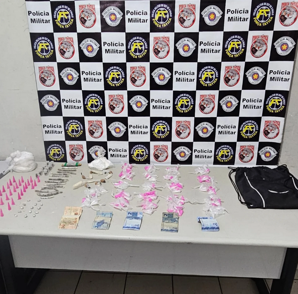 O suspeito foi alcançado após uma breve perseguição por uma área de mata. Durante a abordagem, os policiais encontraram com ele uma mochila contendo 328 porções de cocaína, 44 de crack e 31 de maconha, além de porções a granel de cocaína e dinheiro em espécie.