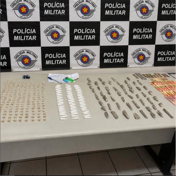 Apreensão ocorreu no cruzamento das ruas Plínio de Queirós e Delfim Moreira; porções de cocaína, crack e maconha foram recolhidas