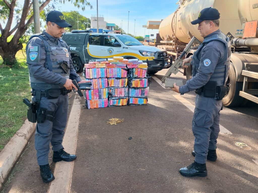 Além do grande volume de entorpecentes, a operação revelou a presença de armamento de uso restrito dentro de uma caixa na cabine. Foi apreendido um fuzil Colt 5.56, uma pistola 9mm com três carregadores e 133 munições no calibre 5.56, aumentando a gravidade da ocorrência.
