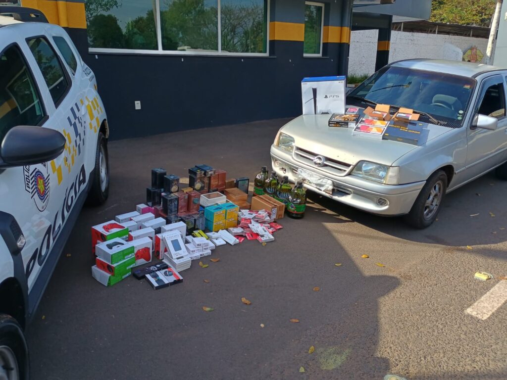 Durante a fiscalização, os policiais abordaram o veículo, que era ocupado por um condutor de 41 anos e uma passageira de 26. Na vistoria do porta-malas, foram encontradas diversas mercadorias de origem estrangeira, como perfumes, azeites e peças de videogame, todas desprovidas de qualquer documentação fiscal. Os itens tinham como destino final a cidade de Avaré.