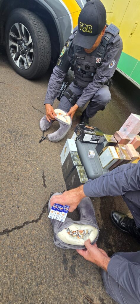 Equipes do Tático Ostensivo Rodoviário (TOR) prenderam em flagrante uma mulher que transportava centenas de ampolas de medicamentos de alto custo e perfumes escondidos dentro de almofadas de pescoço. A abordagem ocorreu durante a ‘Operação Impacto’ em um ônibus de turismo que fazia o itinerário Foz do Iguaçu (PR) para o Rio de Janeiro (RJ). Além do material ilícito encontrado com a passageira, o veículo carregava uma grande quantidade de produtos oriundos do Paraguai sem documentação fiscal.