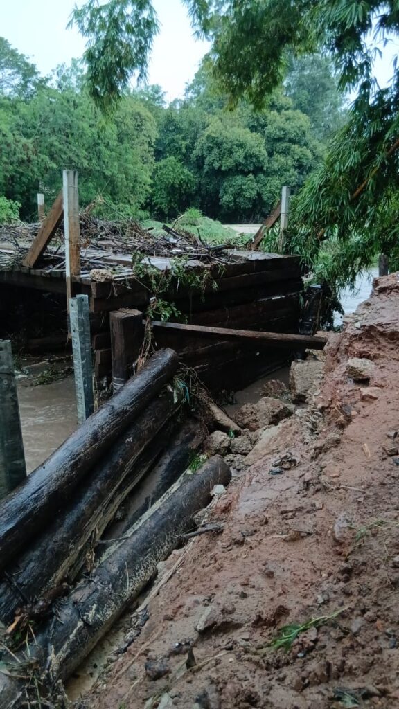 “Estamos com problema na ponte de Dirceu, cuja cabeceira caiu essa noite. Importante destacar que foi um problema na cabeceira apenas, a ponte não caiu. Assim que parar de chover, a equipe da Secretaria de Infraestrutura fará o conserto, pois trata-se de reparo rápido. E uma outra ponte em Dirceu, que dá acesso ao bairro Florida, apresentou problemas, mas a Secretaria de Infraestrutura já está atuando e finalizando as ações para liberar o acesso nesse equipamento. Temos outras pontes menores, uma na estrada do Pombo depois da Igreja Batista, que está com problema na cabeceira também, e que a Secretaria de Infraestrutura fará intervenção”, explicou Leonardo Mascarin.