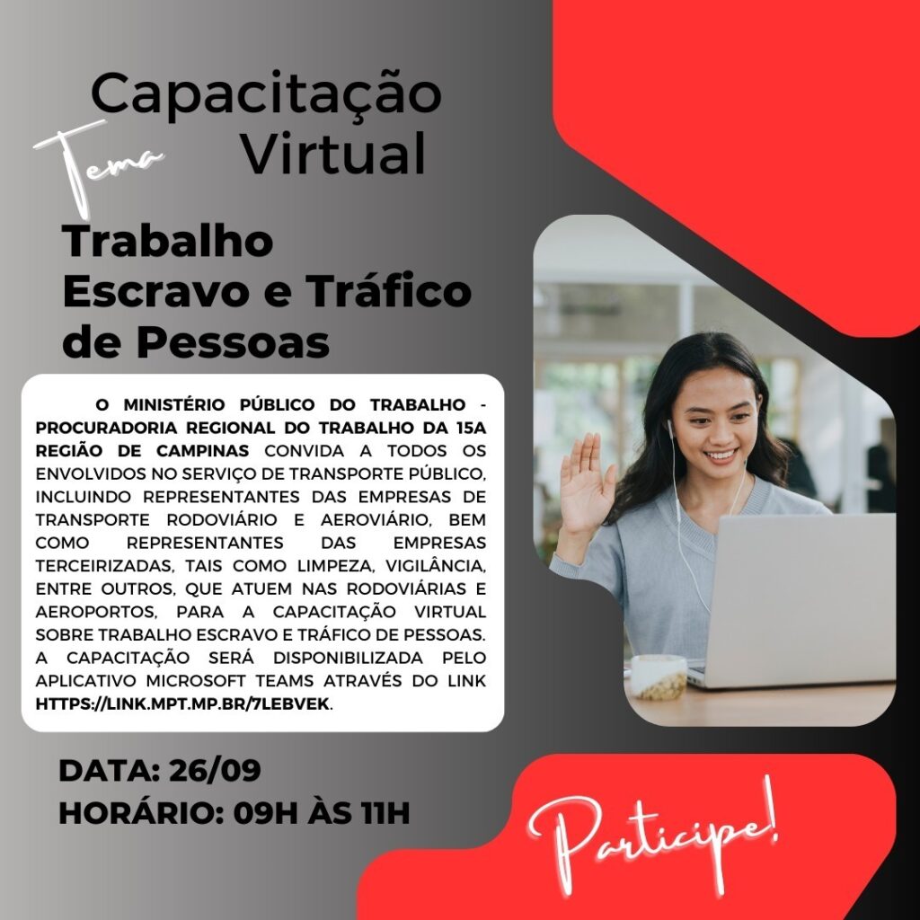 A capacitação será disponibilizada pelo aplicativo Microsoft Teams através do link: https://link.mpt.mp.br/7Lebvek e os participantes terão direito a certificação.