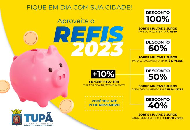 O contribuinte da cidade de Tupã em débito com a prefeitura pode aderir ao REFIS (Programa de Renegociação Fiscal de Dívidas) até 17 de novembro. Os pedidos de regularização e parcelamento de tributos vencidos feitos pelo site www.tupa.sp.gov.br/atendimento terão acréscimo de 10% de desconto nos juros.