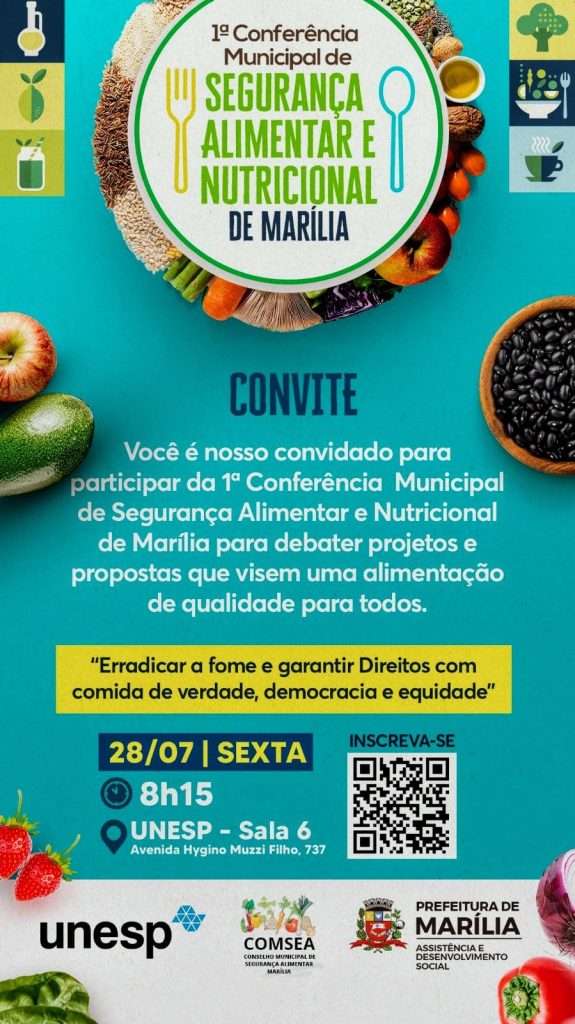 A Prefeitura Municipal de Marília e a Secretaria Municipal de Assistência e Desenvolvimento Social de Marília, com o apoio do campus da Unesp (Universidade Estadual Paulista) e do Conselho Municipal de Segurança Alimentar (Comsea), promovem nesta sexta-feira, dia 28 de julho, a partir de 8h15, a 1ª Conferência Municipal de Segurança Alimentar e Nutricional de Marília. A plenária acontecerá na sala 6 do campus da Unesp, que fica na região Oeste, avenida Hygino Muzzi Filho, nº 737.