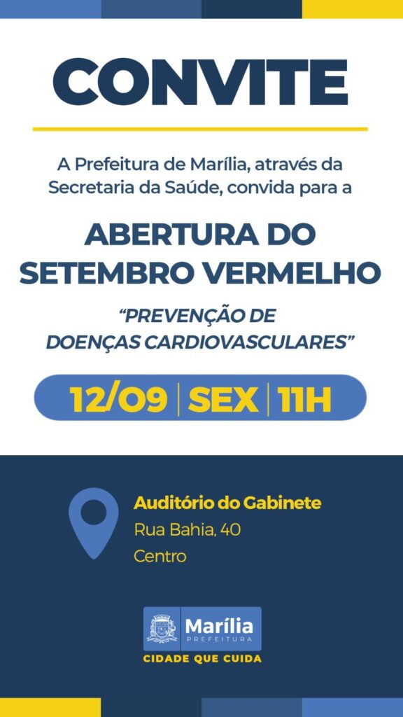 A Prefeitura de Marília, por meio da Secretaria Municipal da Saúde, promoverá nesta sexta-feira (12), às 11h, no auditório do gabinete (2º andar do Paço Municipal), a abertura oficial da Campanha Setembro Vermelho, que tem como objetivo a conscientização sobre a importância da prevenção de doenças cardiovasculares, como infarto e AVC (Acidente Vascular Cerebral).