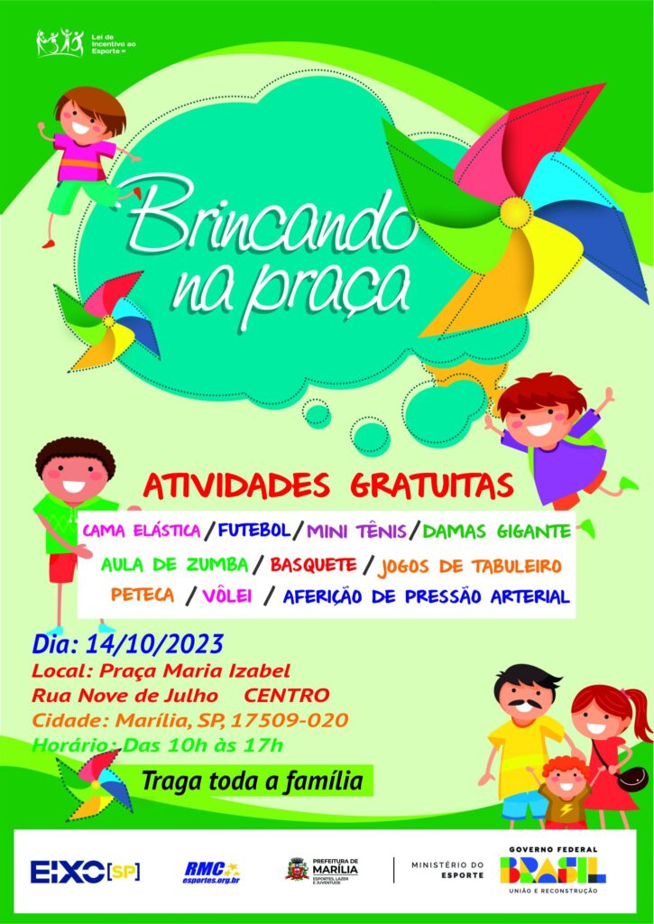 Neste fim de semana, o projeto “Brincando na Praça” levará muita diversão para as crianças de Marília e Bauru. Trata-se de um evento gratuito com atividades lúdicas e esportivas para crianças de todas as idades, como vôlei, futebol, cama elástica, peteca, jogos de tabuleiro, desenho, basquete e muito mais. O projeto conta com apoio da Eixo SP Concessionária de Rodovias.