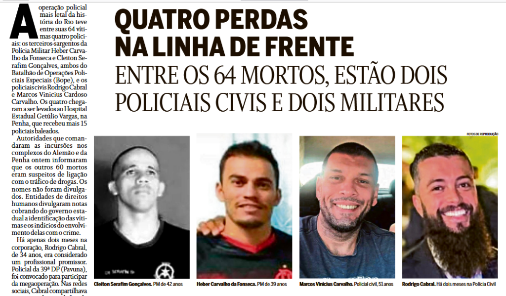 A operação policial considerada a mais letal da história do Rio de Janeiro vitimou quatro agentes de segurança, conforme reportagem publicada nesta quarta-feira, dia 29 de outubro, pelo jornal O Globo. Entre as mais de 100 mortes registradas nos complexos do Alemão e da Penha, dois eram policiais militares e dois eram policiais civis. Os quatro profissionais foram levados ao Hospital Estadual Getúlio Vargas, na Penha, que atendeu um total de 15 policiais feridos por disparos durante as incursões.