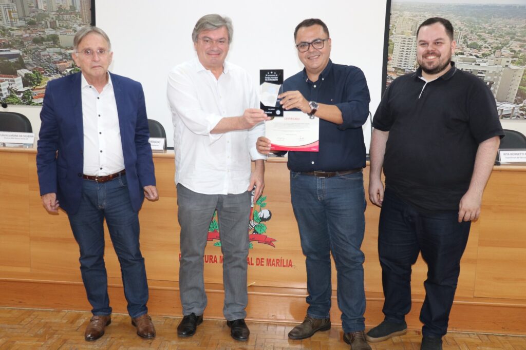 Conforme ressaltou Helter Bochi, a curadoria da Mind Lab avaliou, entre os municípios que aderiram à metodologia do Programa MenteInovadora, quais foram os principais casos de sucesso e os que mais se destacaram pelo reforço no ensino. E, ainda, por adotarem práticas inéditas para auxiliar no desenvolvimento socioemocional dos alunos. “Entre os quesitos avaliados pela banca julgadora estiveram temas como gestão participativa, formação e qualificação de professores, suporte no desenvolvimento socioemocional, critérios de avaliação e monitoramento, além do bom uso da tecnologia nas práticas educacionais”, completou o secretário. O prêmio foi entregue na solenidade realizada no Paço Municipal ao prefeito Daniel Alonso, secretário Helter Bochi, diretora da Emef (Escola Municipal de Ensino Fundamental) Nicácia Garcia Gil, Flávia Simone da Silveira e supervisora de ensino, Rita de Cássia Borguetti. Diretores de todas as escolas integrais de Marília e professores também prestigiaram a cerimônia.