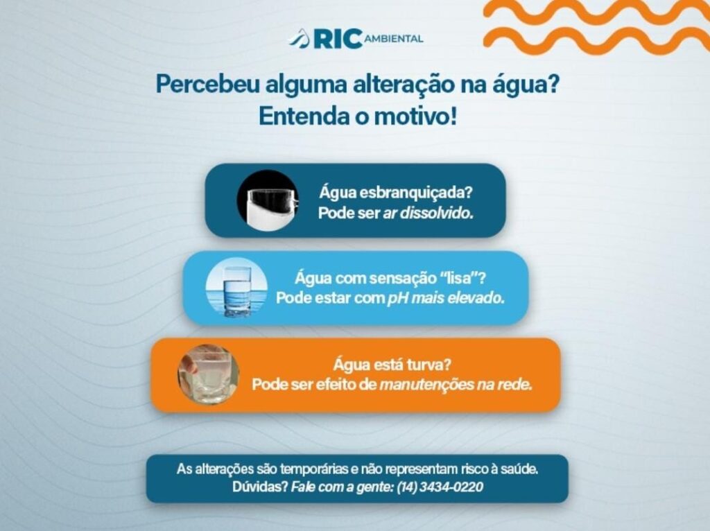 A RIC Ambiental atua com base na transparência, na responsabilidade técnica e no compromisso com a saúde da população, com o objetivo de garantir um abastecimento seguro, contínuo e com qualidade reconhecida. Sempre que houver dúvidas ou percepções diferentes na água, a população pode acionar os canais de atendimento da concessionária pelo telefone ou WhatsApp (14) 3434-0220, que está preparada para receber os relatos, investigar cada caso e adotar as providências necessárias.