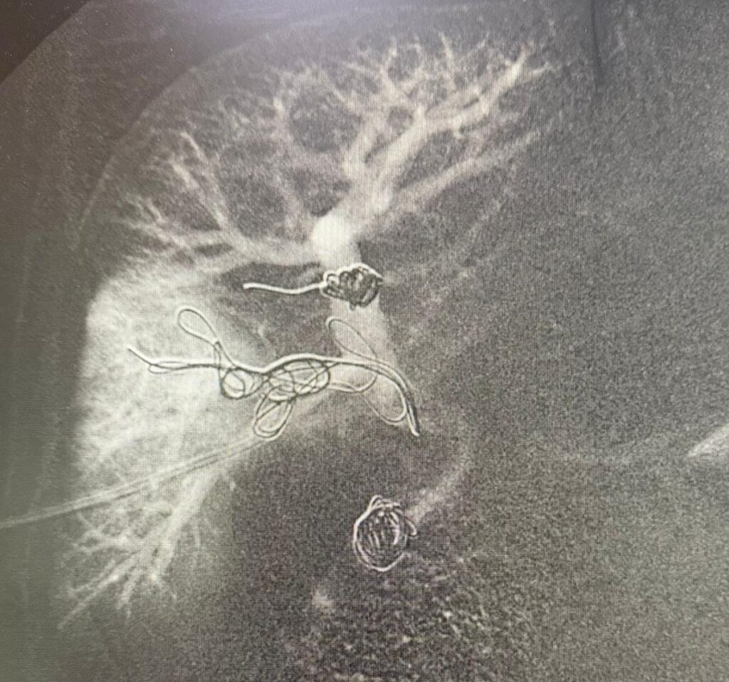 Como parte deste preparo, foi realizada a punção trans-hepática dos ramos portais direitos, seguida da embolização. Durante o procedimento, são introduzidos materiais específicos, como molas e partículas, nas veias do fígado, com o objetivo de interromper o fluxo sanguíneo na área afetada.