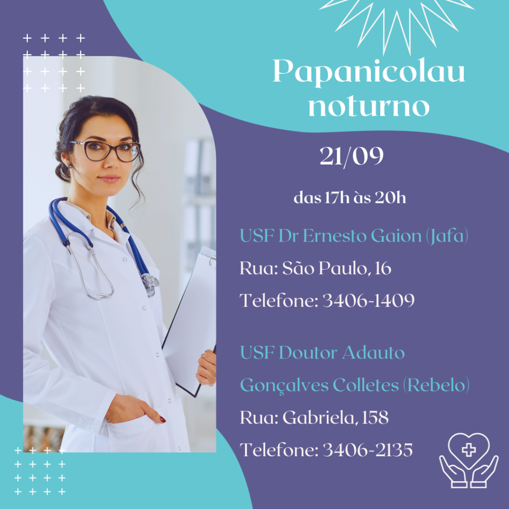 Nesta quinta-feira (21), as unidades  USF Doutor Ernesto Gaion, conhecida como USF Jafa, localizada na rua São Paulo, 16 e a  unidade USF Adauto Gonçalves Colletes, conhecida como USF Rebelo, localizada na rua Gabriela, 158, atenderão 17h às 20h, somente para coletar o exame.